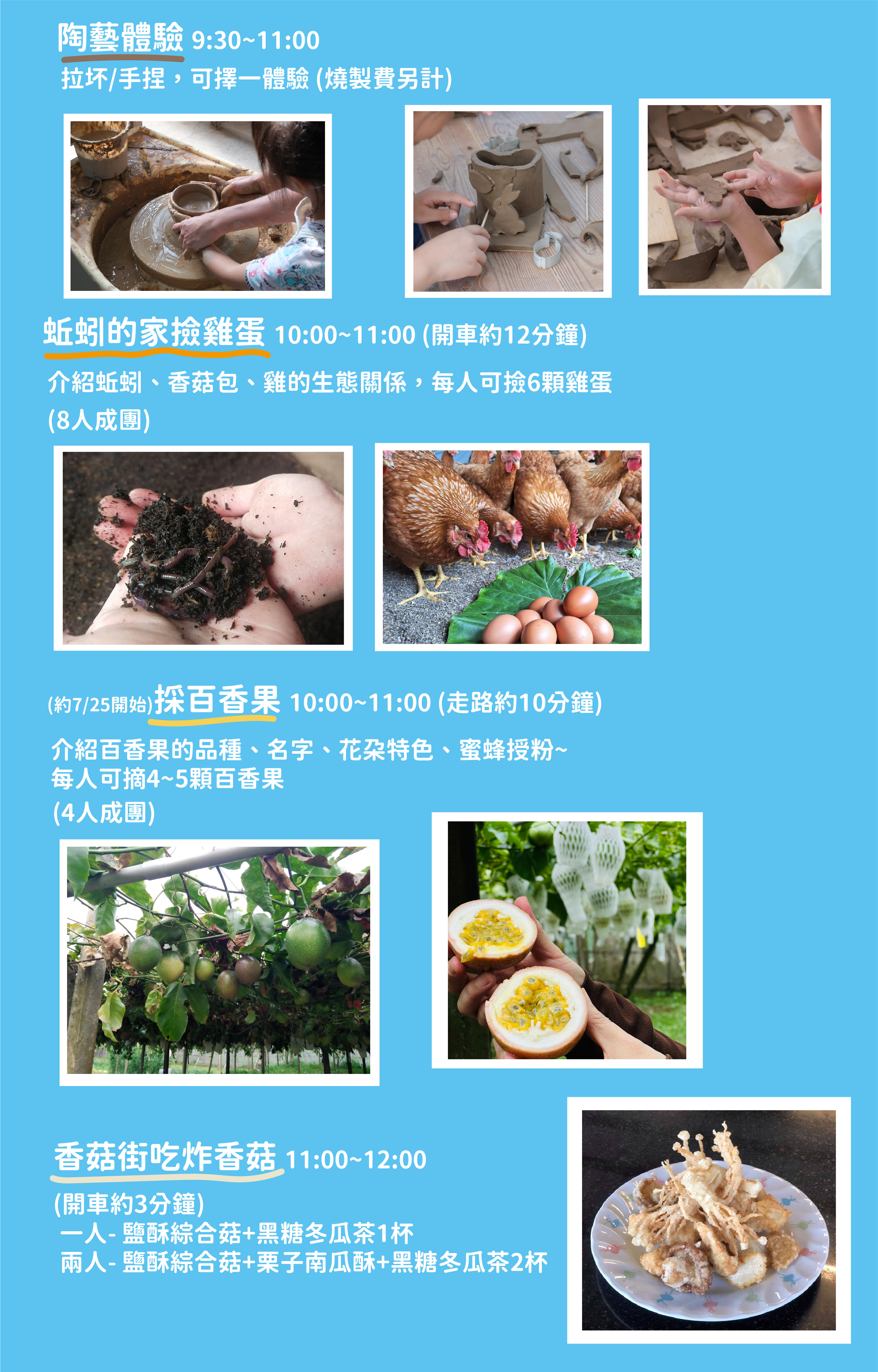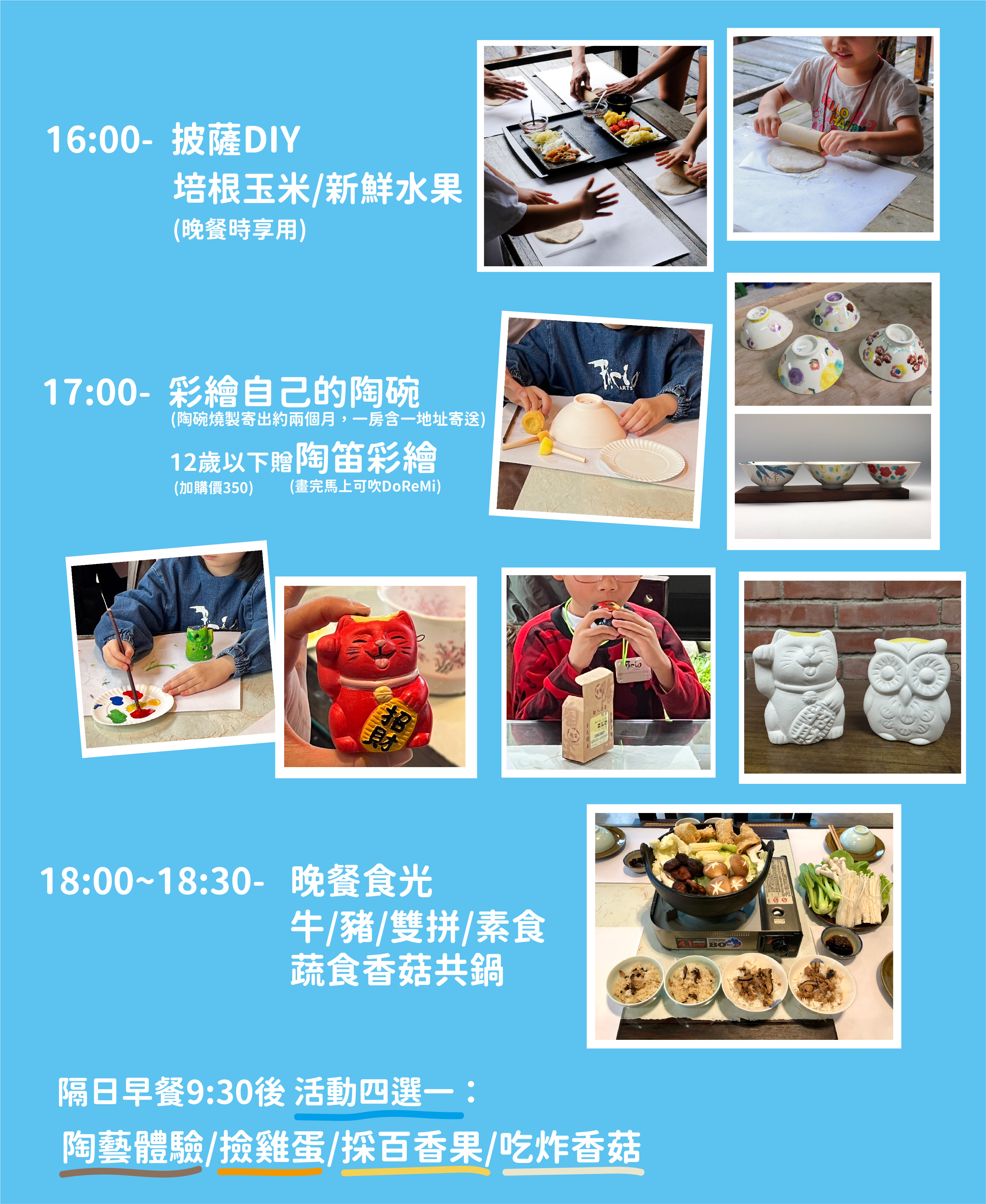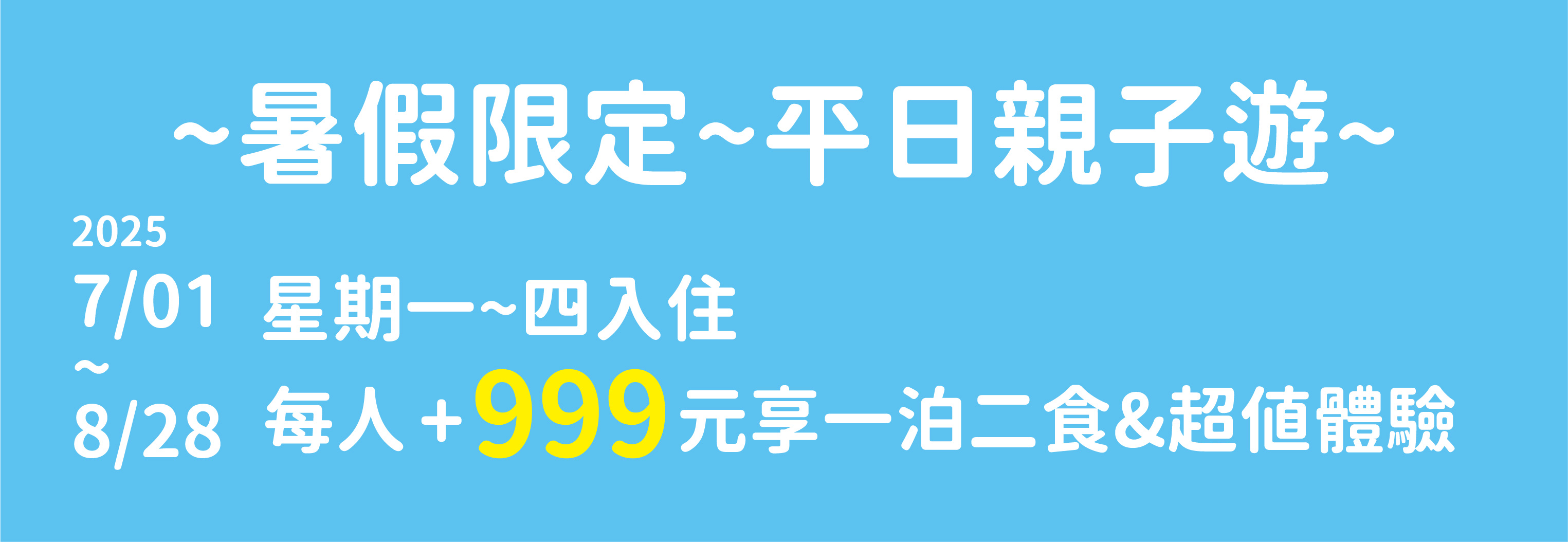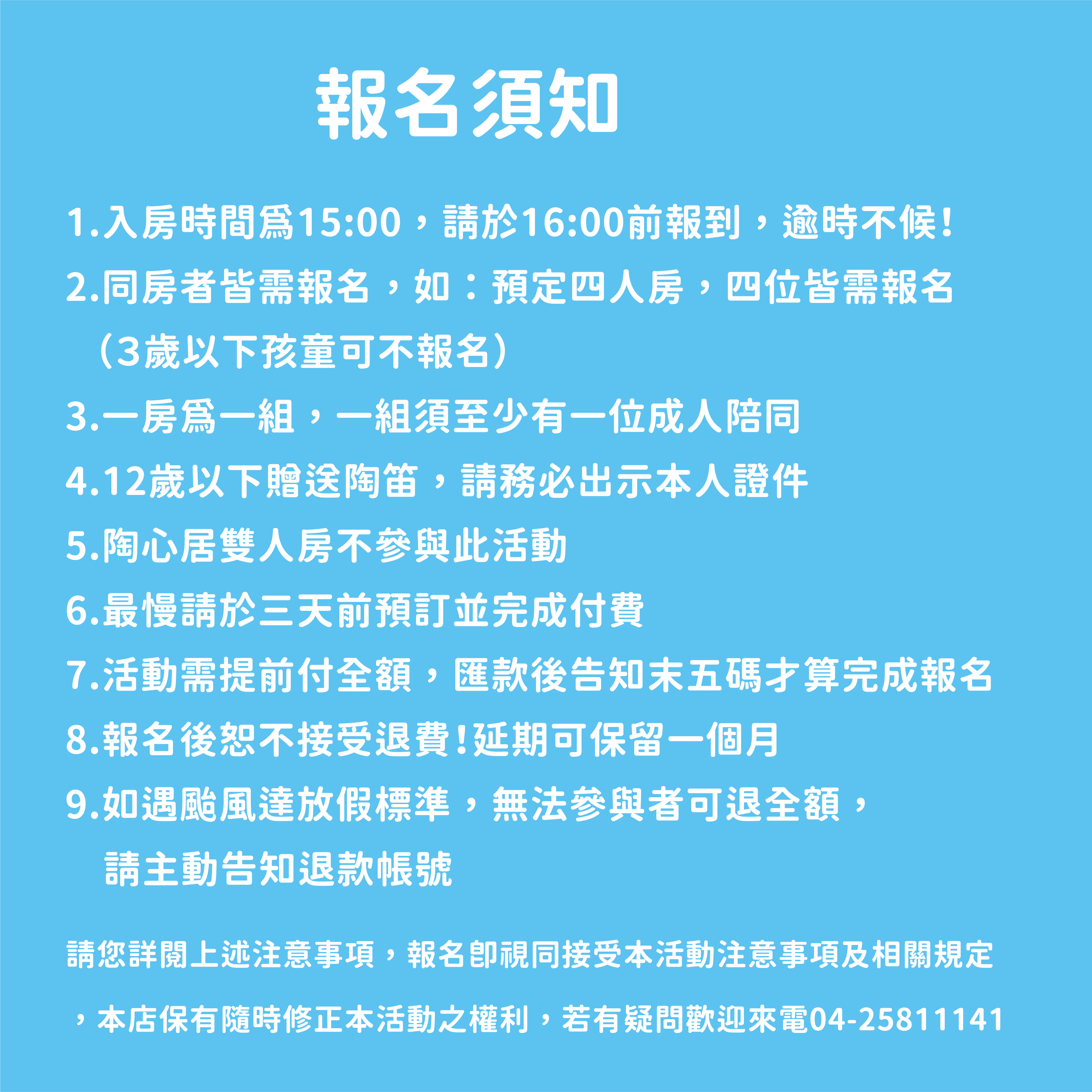 7/1-8/28 星期一~四入住 每人+999 即可享有限時套裝行程 12歲以下孩童出示證件 再加碼送陶笛彩繪 (陶心居雙人房不參與此活動) 報名連結:https://forms.gle/5PCQPGRTCyu5FE68A